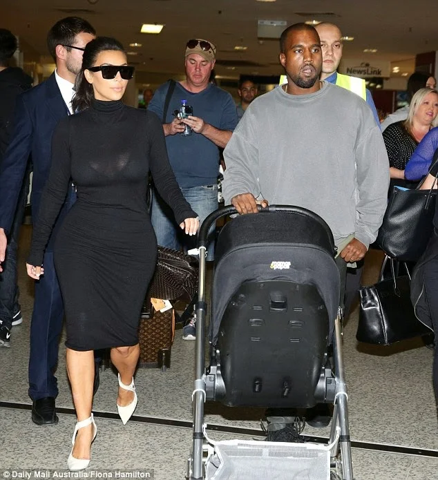 Kim Kardashian and Kanye West were escorted through the airport by bodyguards and several members of the Australia Federal Police. Little North,the couple's daughter was also part of the occasion.Though she was hiding safely in her buggy,probably asleep.