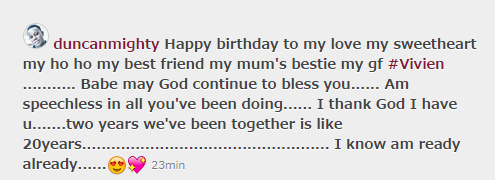 had posted a message ,wishing his girl friend a happy birthday and saying all these sweet things about her,he rounded off the message by saying ,in fact i'm ready..so what he was saying was "i'm ready to settle down" Congrats Duncan,she sounds like a great girl from all the things you wrote about her earlier.