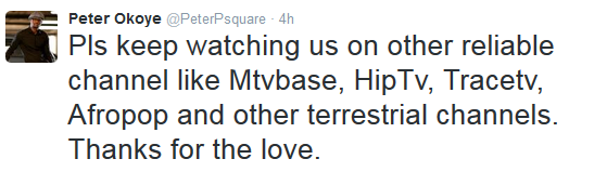P Square and Sound city have an issue going on.Peter Okoye of P Square has revealed that Sound City are refusing to play their videos.Now why would Sound City,arguably Nigeria's No 1 entertainment Tv station refuse to play Arguably Africa and Nigeria's most famous and successful musical group P Square? Something is amiss and this looks like its gonna run and run.But i am not sure the right approach for Peter was to ask fans to ignore